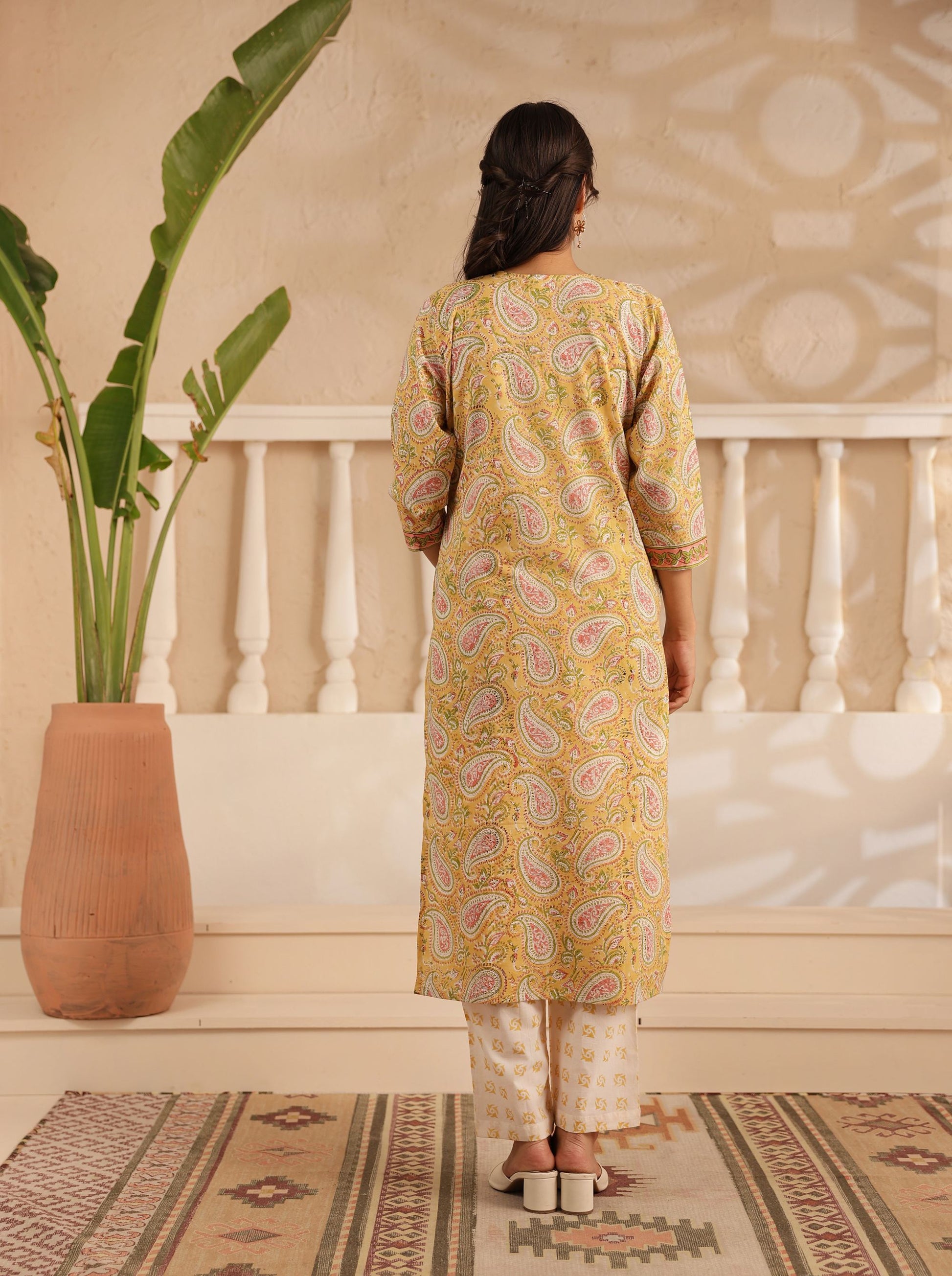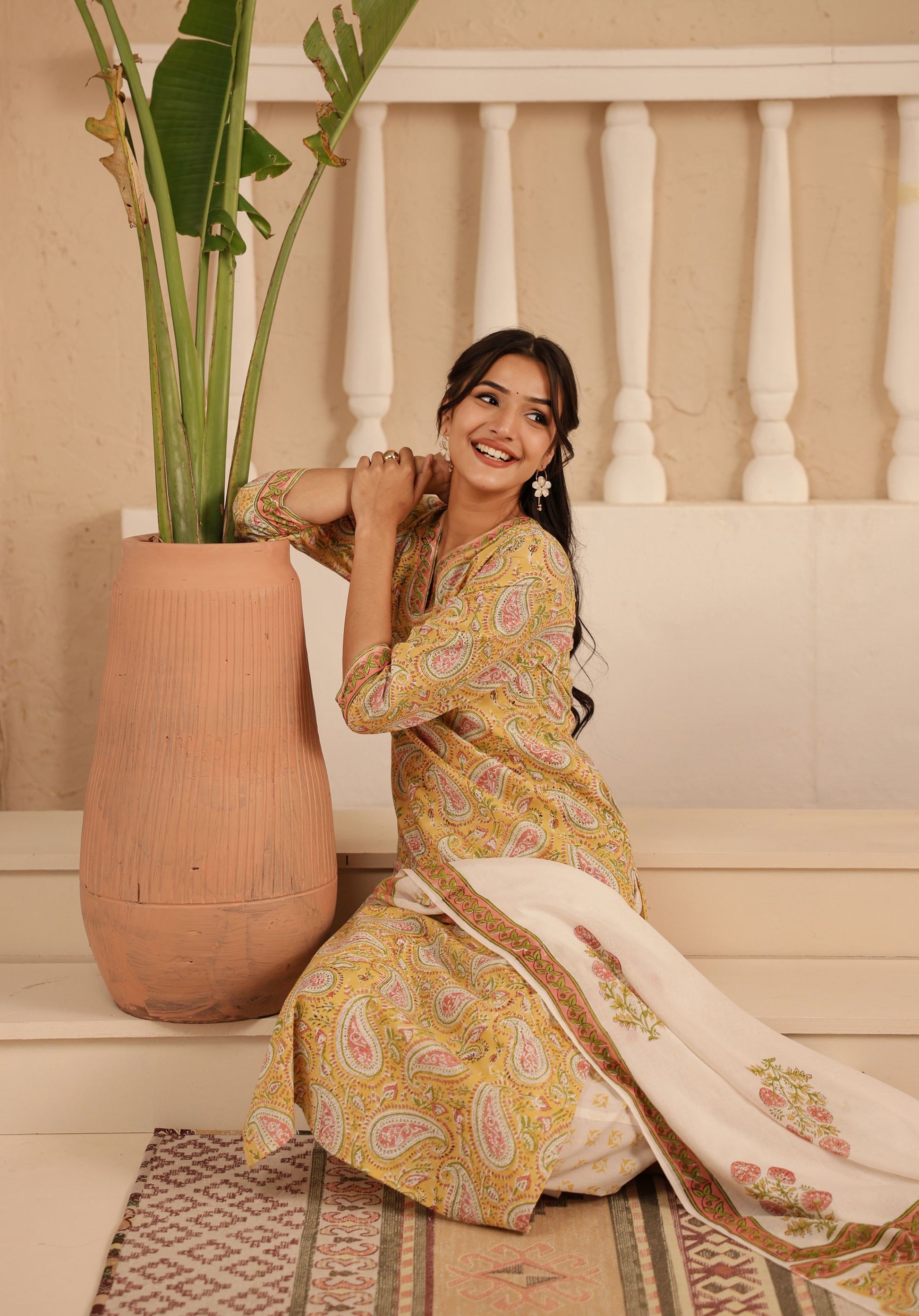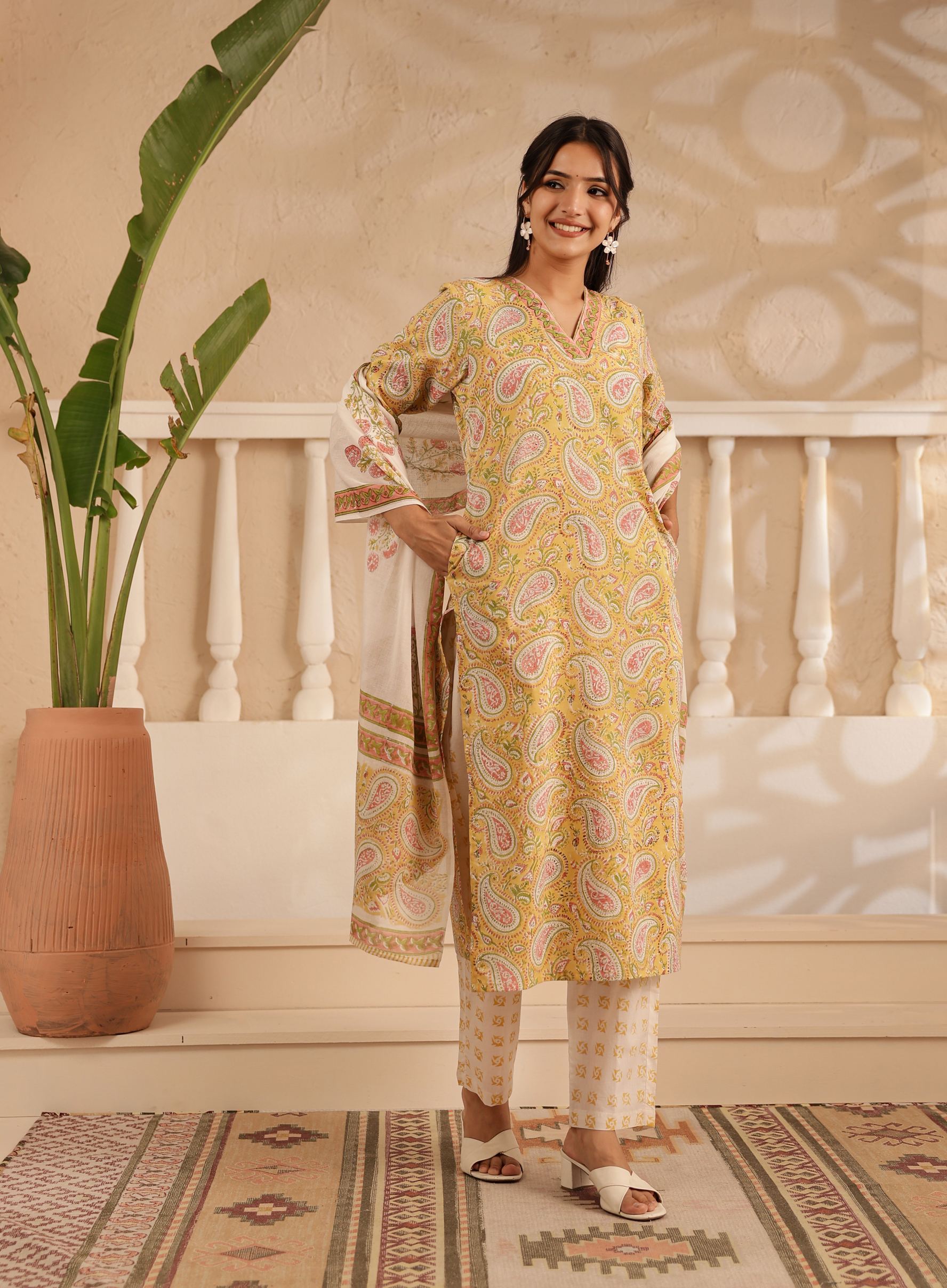 - Piece : 3 Piece Hand Printed Straight Kurta & Pant