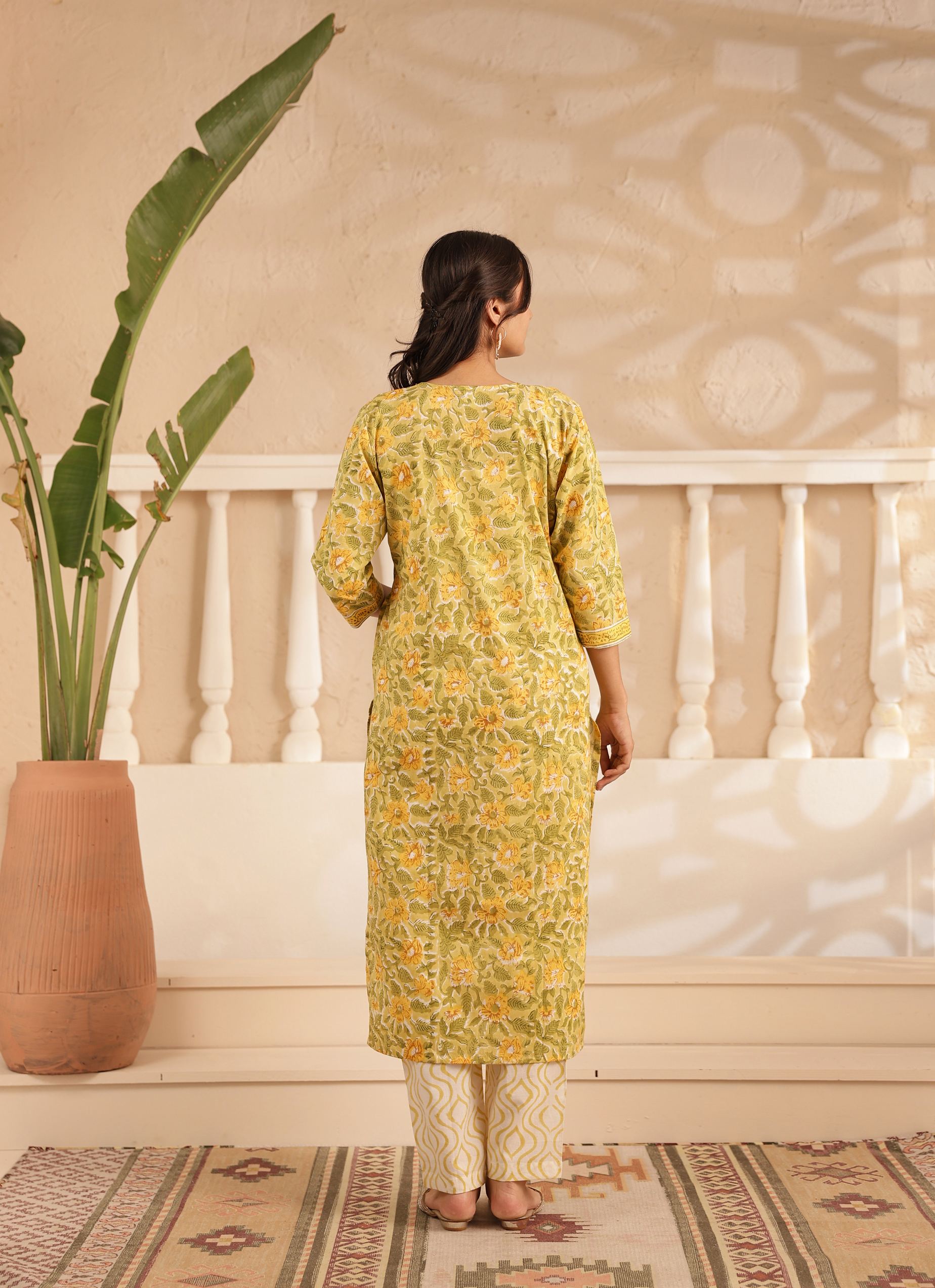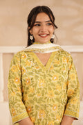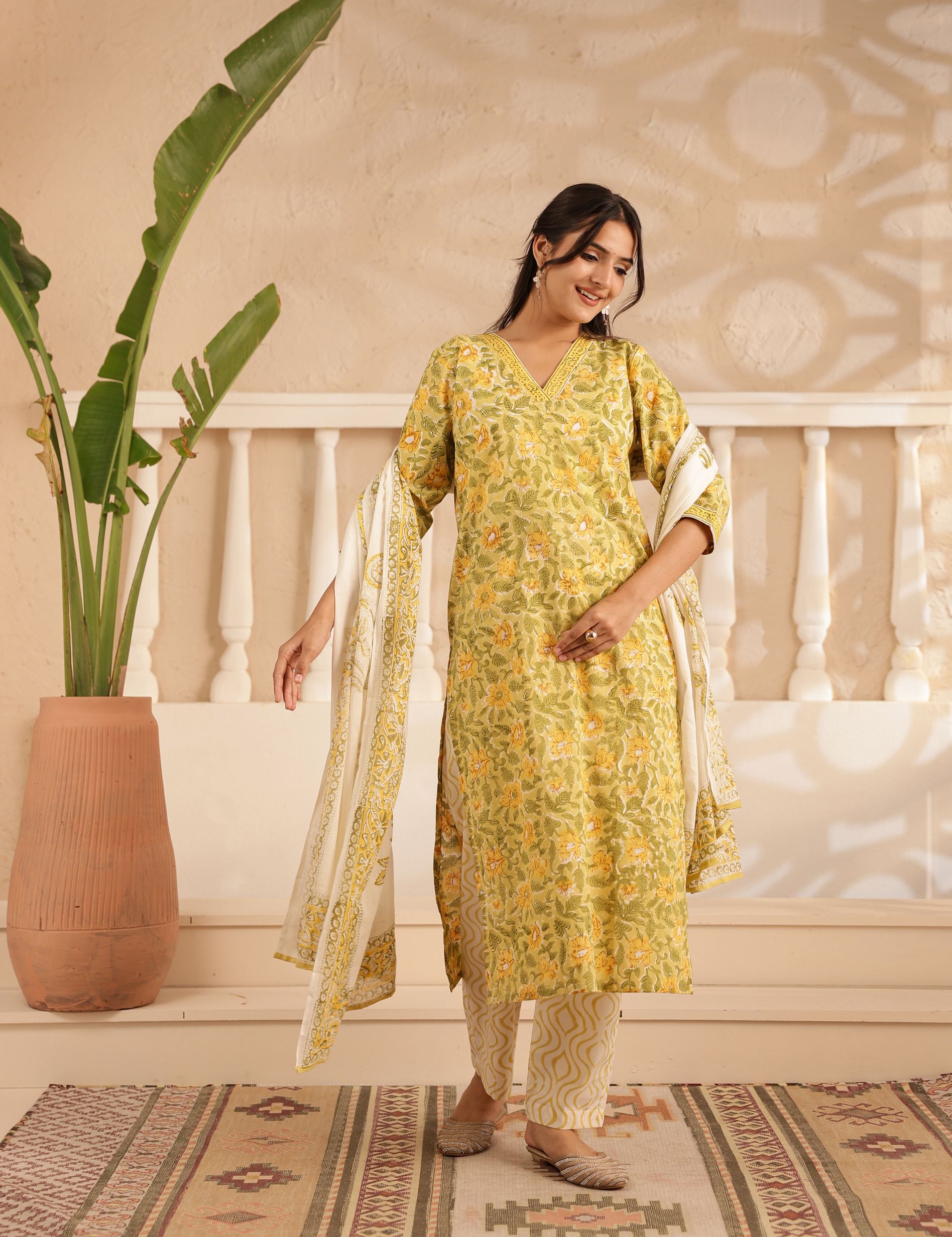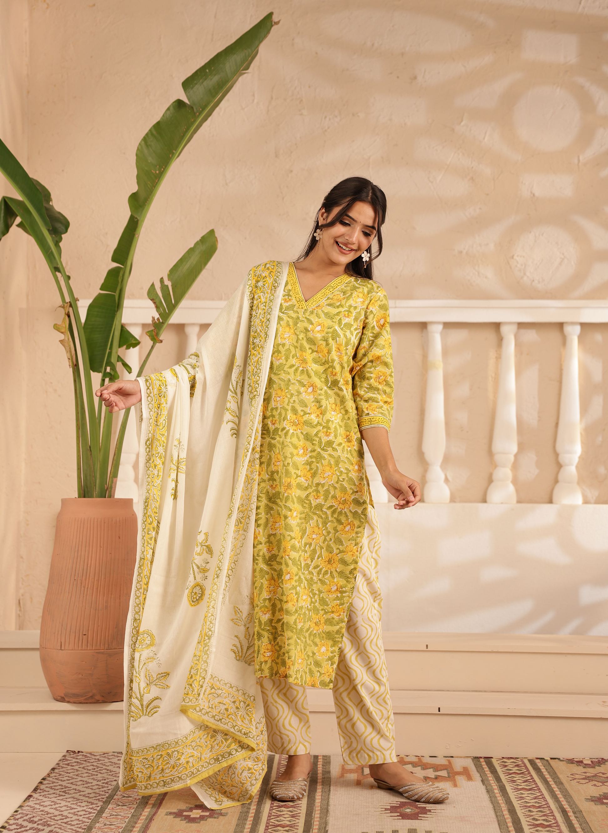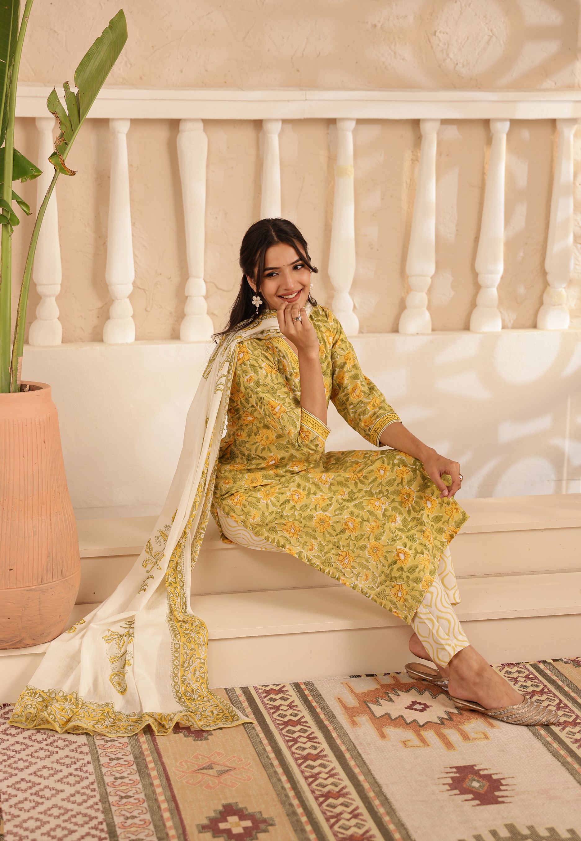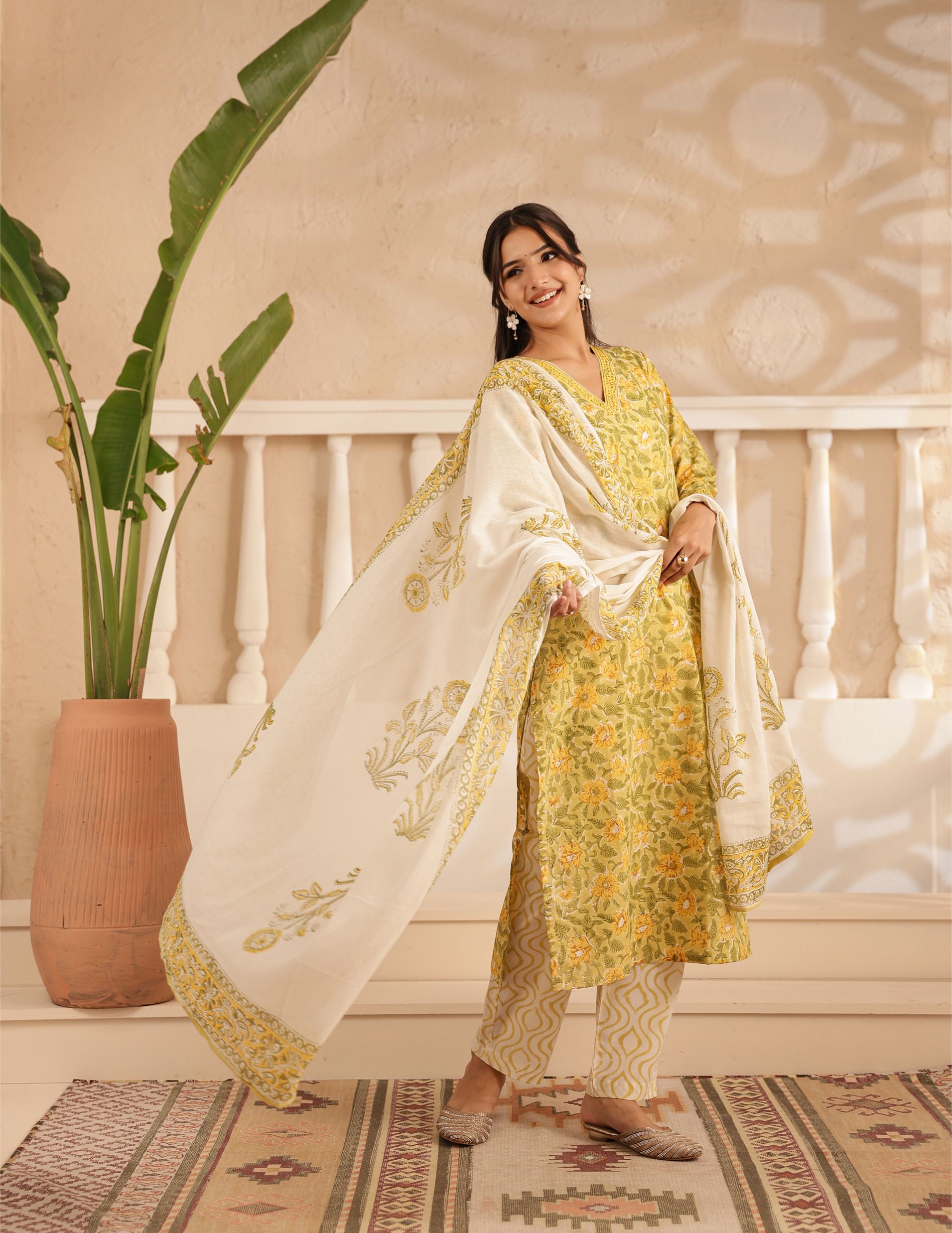 - Piece : 3 Piece Hand Printed Straight Kurta & Pant