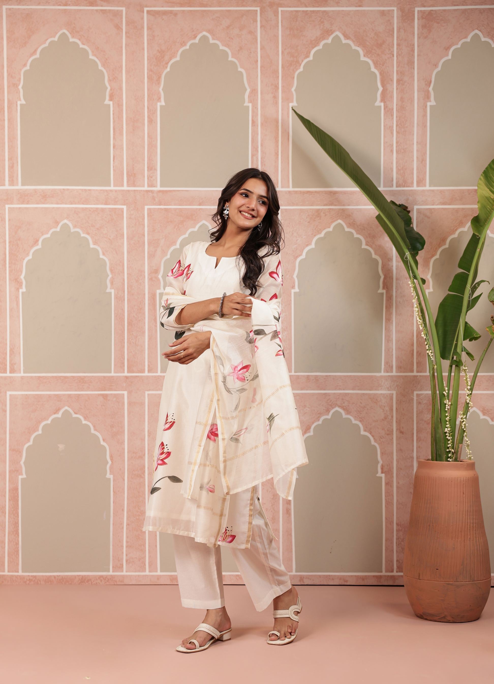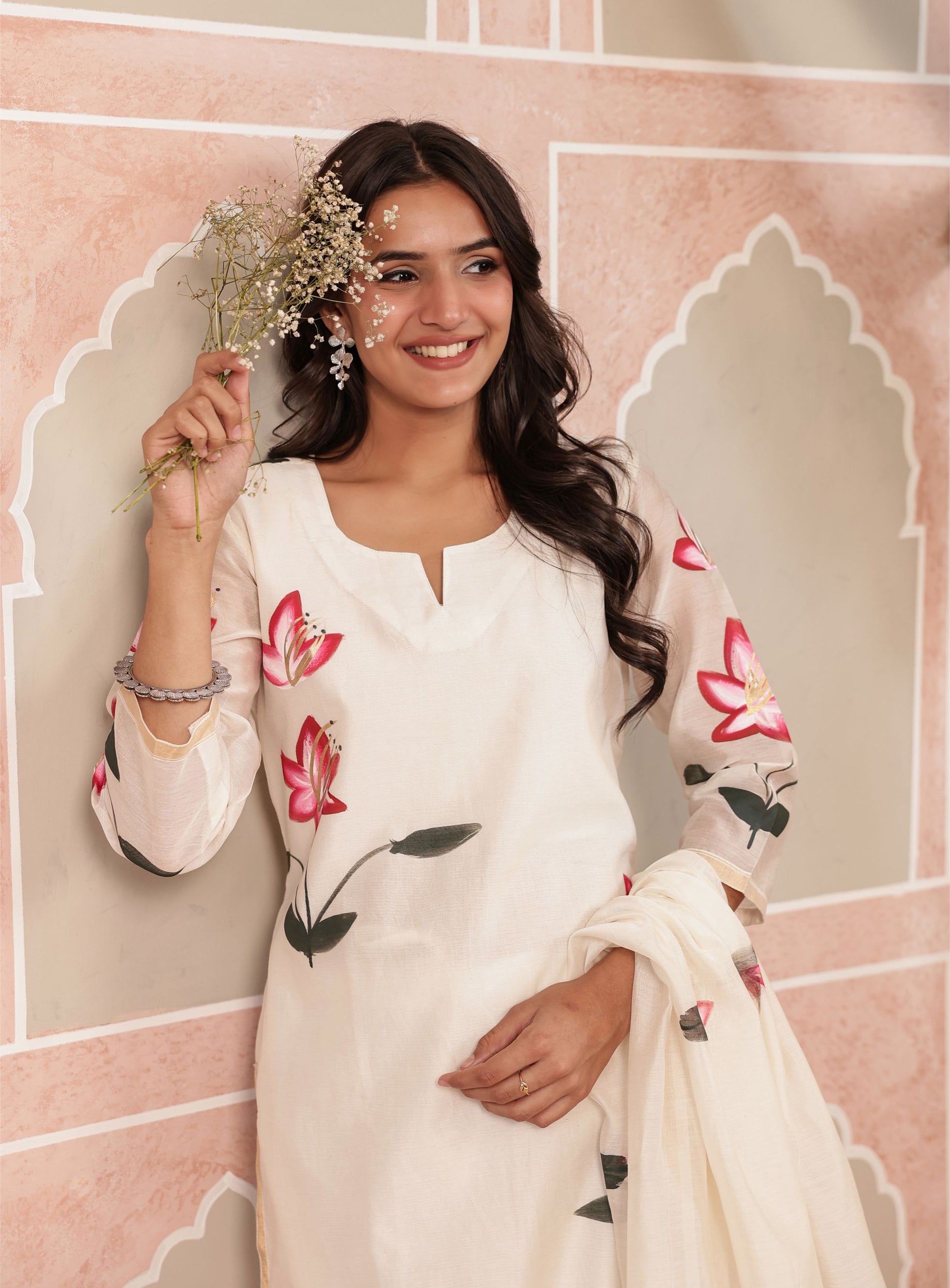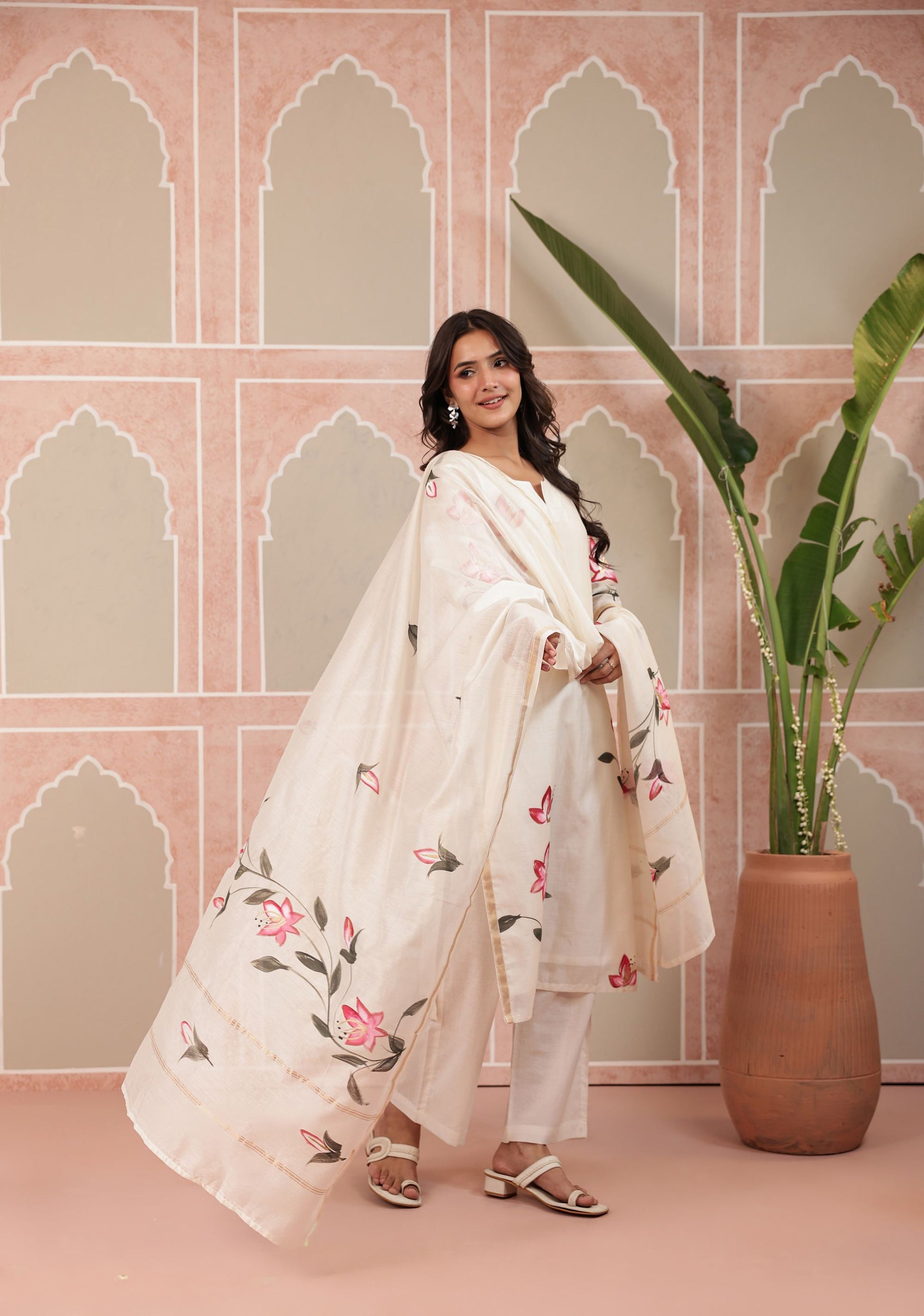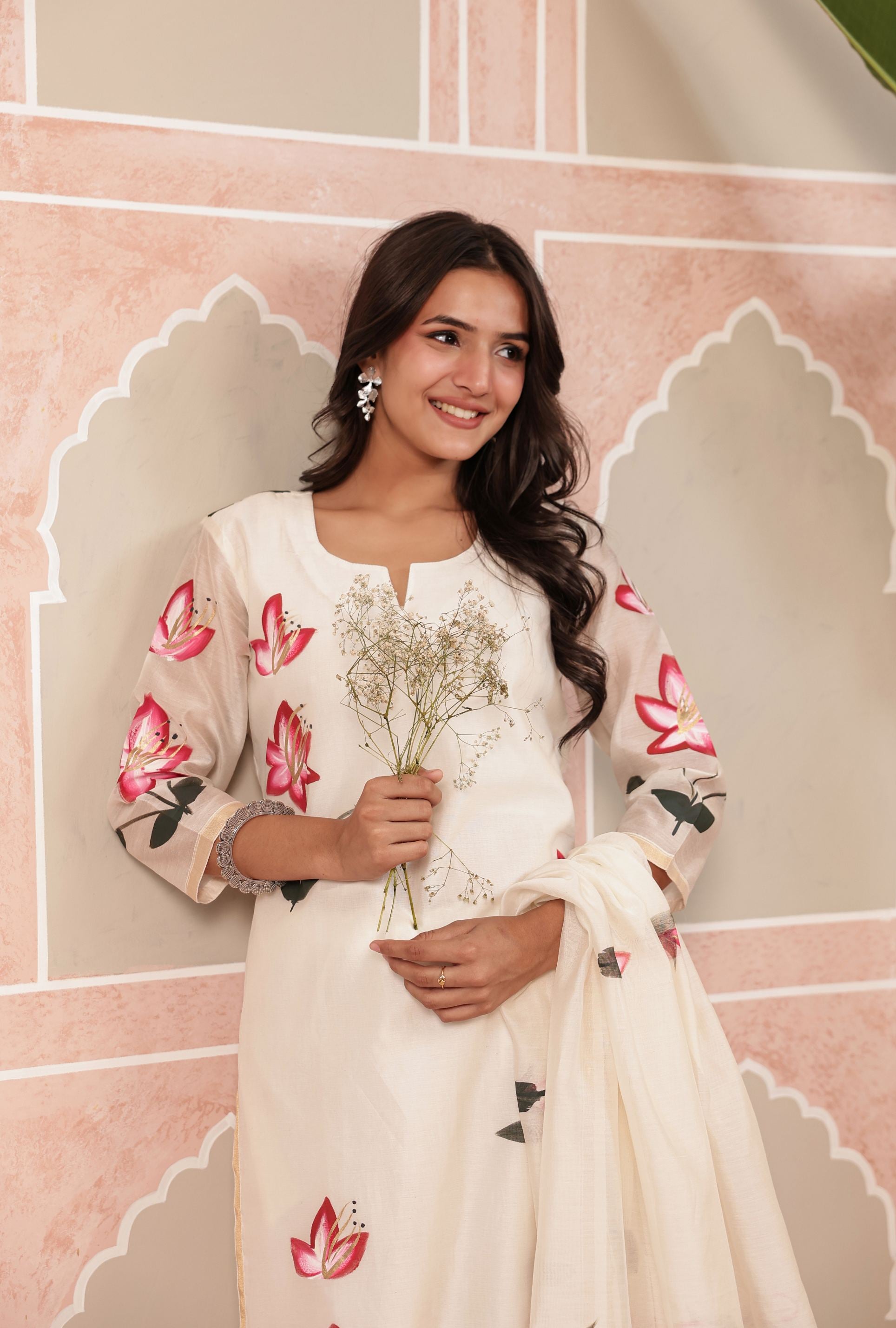 - Piece : 3 Piece Hand Printed Straight Kurta & Pant